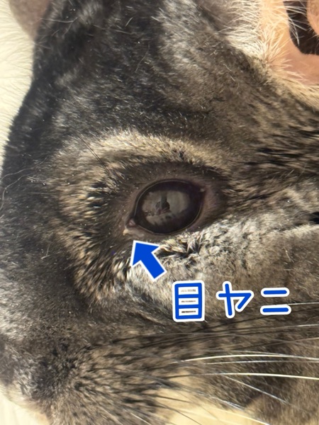 目の周りの毛が、涙で濡れて流れたような跡がついてるし。目の周りがいつもより、気持ち、赤っぽいし。目ヤニもついてるな。