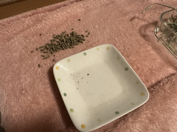 おうちゃんは皿からこぼれたペレットはいっさい食べません。