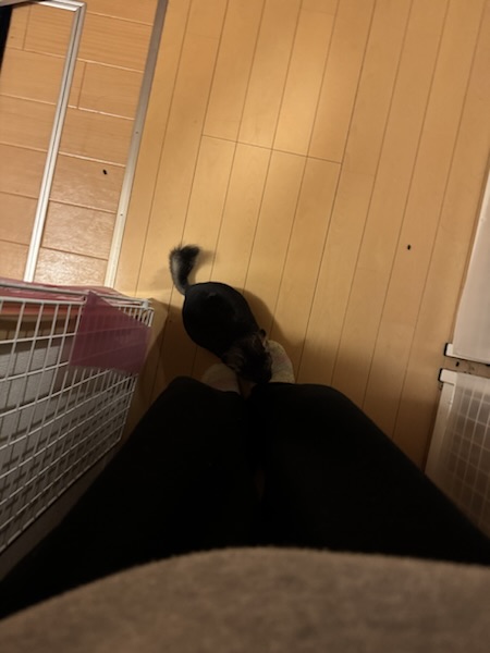「おうちゃ〜んもう寝るからお部屋帰ろうよ〜」と説得するためしゃがんだ飼い主を