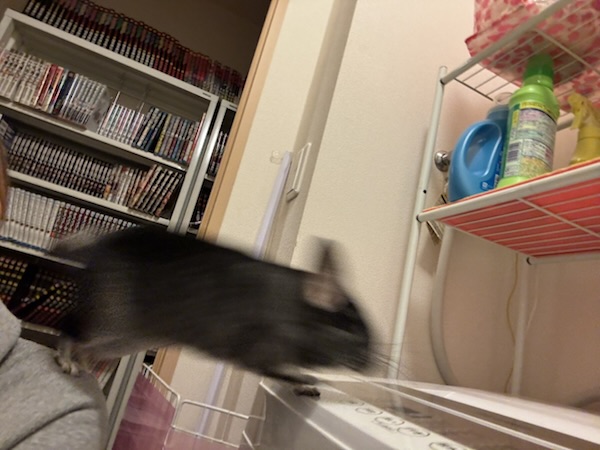 このあと洗面所はいったら、アピール方法その2、「のせて!のせて!しゃがんで踏み台になって!!」と飼い主の足に絡みまくるのが始まってしまうので
