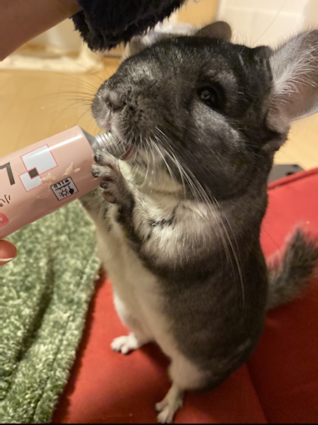 「写真撮るのに顔が邪魔!」と言われてラクトバイトが見えなかった友達がちょっとラクトバイト押しすぎて毛についてガビガビになっちゃったおうちゃんですが